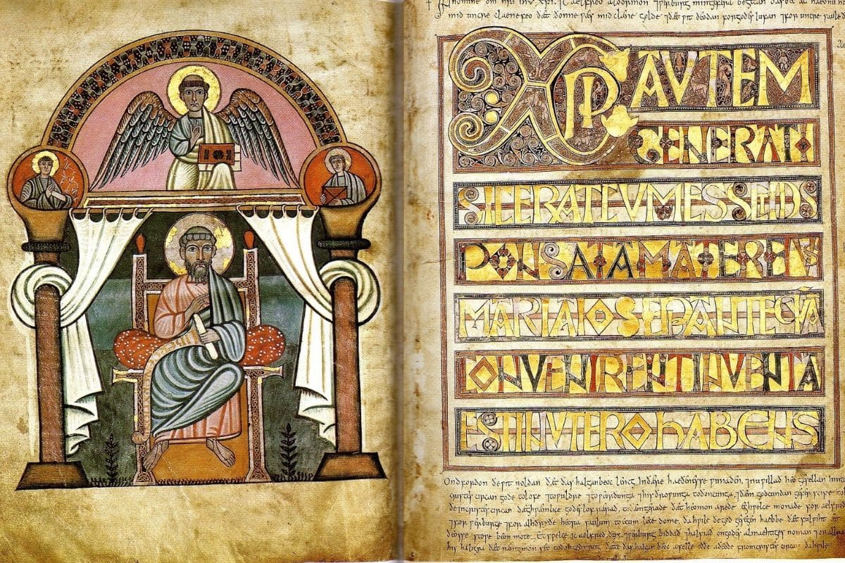 Bild: Stockholm Codex Aureus, även känd som Codex Aureus of Canterbury och Codex Aureus Holmiensis är en evangeliebok skriven i mitten av 700-talet i Southumbria, troligen i Canterbury. På 1500- och 1600-talen låg den i Spanien, och 1690 köptes den till den svenska kungliga samlingen. Den förvaras numera på Nationalbiblioteket. Bilden är ett porträtt av Matteus med dekorerad text från Matteusevangeliet, Matteus 1:18.