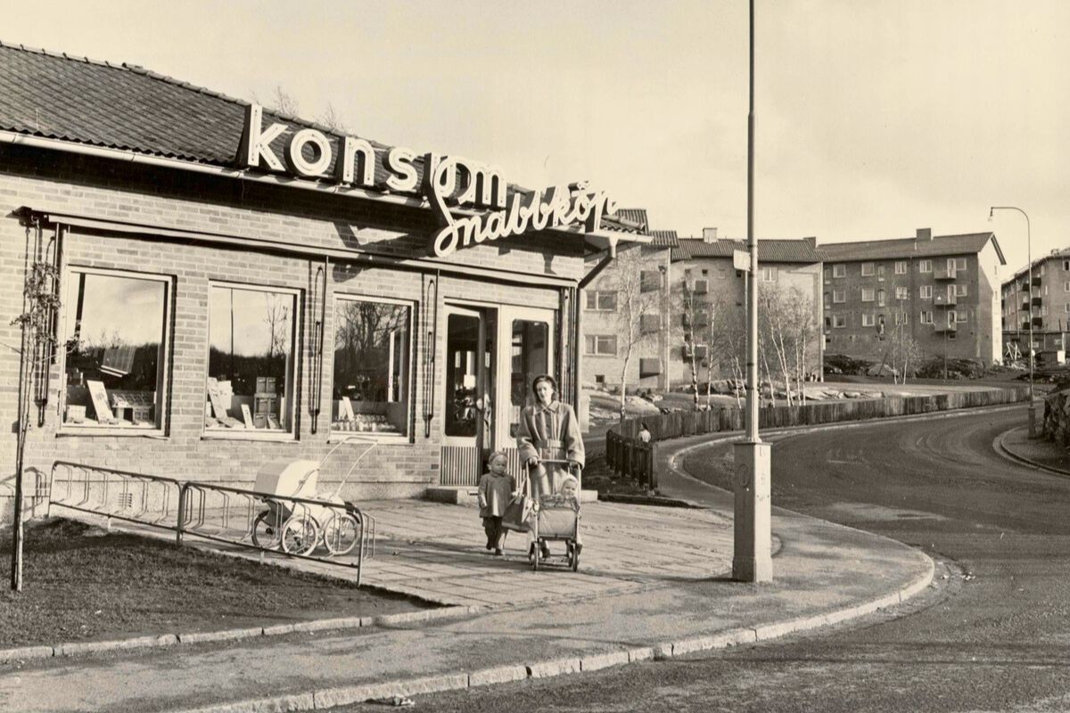 Bildtext: En kvinna med barnvagn utanför Konsum Snabbköp – ett tidstypiskt motiv från efterkrigstiden då den svenska välfärdsstaten växte fram och konsumtionsmönstren förändrades. Tillgången till snabbköp och modern handel blev en symbol för folkhemmets ökade levnadsstandard och den nya vardagen för familjer. Fotograf: Karl Heinz Hernried