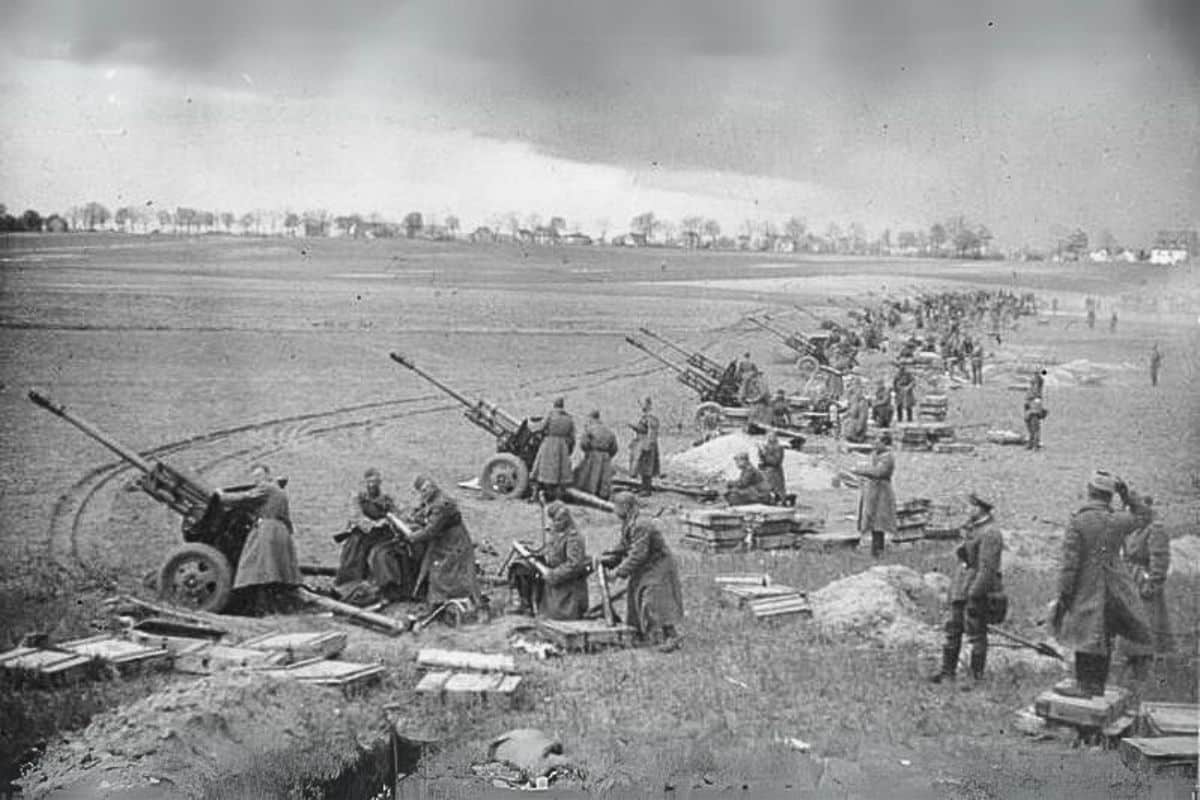 Bildtext: Sovjetiskt artilleri framför Berlin. Slaget vid Seelowhöjderna i april 1945 var Nazitysklands sista större försvarslinje innan Berlin föll. Bundesarchiv, Bild 183-E0406-0022-012 / CC-BY-SA 3.0
